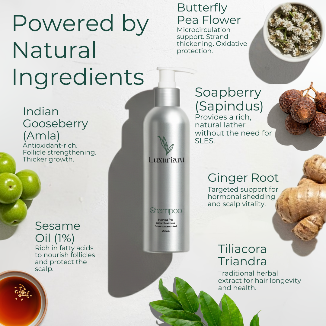 Are you searching for natural ingredients for hair growth that truly deliver visible results? Whether you're struggling with thinning strands, excessive shedding, or simply want to switch to a cleaner hair care routine — you're not alone. The good news is that nature offers some of the most powerful remedies for stronger, healthier hair. In this guide, we’ll break down what natural ingredients are good for hair, explore the best hair growth natural ingredients, and introduce a salon-grade solution that brings them all together: Luxuriant Hair Growth Shampoo Set ( 4 in 1 )— expertly formulated for real, noticeable results. Why Use Natural Ingredients for Hair Growth? Commercial products often contain harsh chemicals like sulphates, silicones, and artificial fragrances that offer short-term shine at the cost of long-term damage. Natural ingredients, on the other hand, are rich in antioxidants, nutrients, and scalp-soothing properties that promote hair growth holistically. At Luxuriant, we’ve built our formulas around this philosophy. Our Hair Growth Shampoo and Serum combine time-tested botanicals with advanced hair science, offering powerful results — naturally. How Natural Ingredients for Hair Growth Actually Work To support healthy growth, natural ingredients work by: Stimulating blood circulation in the scalp Nourishing hair follicles Reducing inflammation and oxidative stress Prolonging the growth (anagen) phase The best hair growth natural ingredients do all of this without irritating the scalp or disrupting your hair’s natural pH balance. 14 Best Natural Ingredients for Hair Growth 1. Rosemary Oil Rosemary improves blood flow and is clinically shown to perform as well as minoxidil — without side effects. It’s a top-tier natural ingredient for hair growth. Used in: Luxuriant Hair Growth Serum to reactivate dormant follicles and reduce thinning. 2. Amla (Indian Gooseberry) Packed with vitamin C and antioxidants, amla strengthens roots and slows down premature greying. Used in: Luxuriant’s Shampoo to fortify follicles and improve scalp health. 3. Castor Oil With a high concentration of ricinoleic acid, castor oil helps thicken hair and boost overall volume. 4. Fenugreek Seeds A protein-rich seed that boosts keratin production and strengthens fragile strands. 5. Peppermint Oil Stimulates scalp circulation and gives a refreshing tingle — great for increasing follicle activity. Found in: Luxuriant Hair Growth Serum for invigorating, daily-use stimulation. 6. Aloe Vera Aloe vera soothes irritated scalps, hydrates deeply, and creates the ideal environment for growth. Formulated into: Luxuriant Hair Growth Shampoo for its cooling and balancing properties. 7. Coconut Oil Naturally rich in fatty acids, coconut oil penetrates the hair shaft to reduce breakage and protein loss. 8. Onion Juice High in sulphur, it boosts collagen and supports regrowth in thinning patches. 9. Green Tea Extract Contains EGCG, an antioxidant that reduces hair loss and prolongs the growth phase. Featured in: Luxuriant Serum for its scalp-protecting and follicle-reviving benefits. 10. Hibiscus Flower Supports stronger roots, stimulates regrowth, and adds natural shine to dull hair. 11. Ginger Boosts circulation while its anti-inflammatory properties keep the scalp healthy. 12. Sesame Seed Oil Deeply nourishing, sesame seed oil helps prevent scalp dryness and premature greying. 13. Butterfly Pea Flower Rich in antioxidants, this vibrant blue flower strengthens follicles and supports a healthy scalp microbiome. 14. Litsea Glutinosa (Indian Laurel) A lesser-known Ayurvedic herb that reduces dandruff, improves scalp health, and strengthens roots. Why Choose Luxuriant Hair Growth Shampoo and Serum? At Luxuriant, we’ve taken these powerhouse ingredients and created a simple, effective system anyone can use — no complicated routines, no compromises. 🌿 What Makes Luxuriant Different? ✅ Powered by 100% natural ingredients backed by science and tradition ✅ Free from sulphates, parabens, and synthetic fragrances ✅ Dermatologically tested for safety and efficacy ✅ Suitable for all hair types and textures ✅ Unisex formula – crafted for both men and women ✅ Visible results in 8–12 weeks with consistent use ✅ Made in Thailand with ethically sourced ingredients ✅ 90-day money-back guarantee – try it risk-free! Whether you're aiming to prevent further loss or spark new growth, Luxuriant Natural Shampoo For Hair Growth cleanse, fortify, and activate your follicles gently and effectively. FAQs: What Natural Ingredients Are Good for Hair? Q: What natural ingredients are good for hair regrowth?A: Rosemary oil, green tea extract, aloe vera, and peppermint oil are particularly effective for stimulating growth. These are all included in Luxuriant’s formulations for their proven benefits. Q: Are Luxuriant hair growth products suitable for men and women?A: Absolutely. Luxuriant plant based shampoo is unisex, designed for any scalp type, hair texture, or gender. Q: What if it doesn’t work for me?A: We stand by our results — which is why we offer a 90-day money-back guarantee. If you’re not satisfied, we’ll refund you in full. No questions asked. Final Thoughts: Let Nature Lead Your Hair Journey When it comes to achieving fuller, healthier hair, turning to natural ingredients for hair growth is more than just a trend — it’s a long-term solution. Whether you’re mixing DIY masks or seeking convenience, the most effective ingredients are already available to you. With Luxuriant Hair Growth Shampoo and Serum, you get the best of both worlds: powerful botanical actives in a clinically designed, easy-to-use system. ✨ Ready to try a proven, natural approach to hair growth?Explore Luxuriant — backed by scientific research nature, driven by results, and protected by our 90-day money-back guarantee.